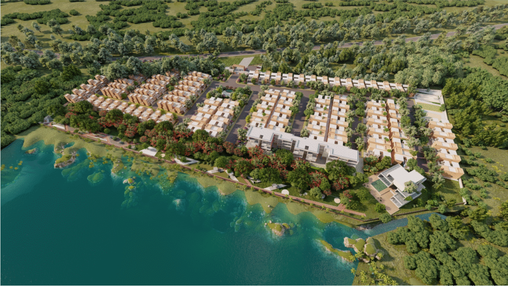 Experience the awe-inspiring beauty of Earth Aroma, where lush greenery and a serene lake embrace the community. The landscape is a testament to nature’s abundance.